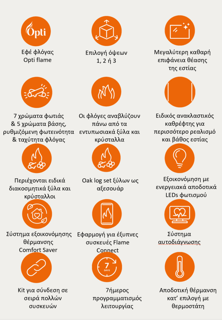 - Η σύγχρονη πατενταρισμένη τεχνολογία Optiflame, παρέχει μια ρεαλιστική αναπαράσταση τρισδιάστατης φλόγας, ενώ ο ενσωματωμένος πολύχρωμος φωτισμός της εστίας προσαρμόζεται σύμφωνα με τη διάθεση, το γούστο και την αισθητική του χώρου σας.