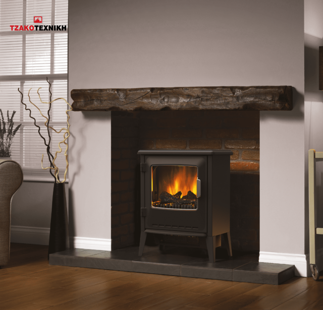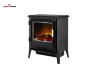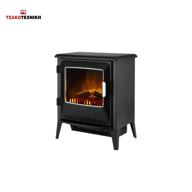 Floor standing electric fireplace in classic stove design, with black metal frame, imitation wood, opening front door and inox details. Hot air exits from the bottom of the unit and heats your space, while the iconic flame, Optiflame® technology, and realistic flickering logs with interior lighting can be seen behind the door glass, combining a traditional look with modern technology to create a warm atmosphere in your space. Its dimensions allow it to be installed even in small rooms. It has a thermostat and remote control.